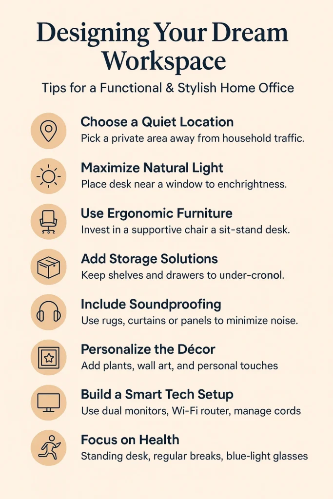 A home office should inspire productivity, support wellness, and reflect your personal style. Start by picking the right location, prioritize natural light, and add ergonomic furniture. Reduce clutter with smart storage, minimize noise, and personalize the space so it feels motivating. A functional and stylish workspace not only improves your workday but also protects your home life from constant overlap.