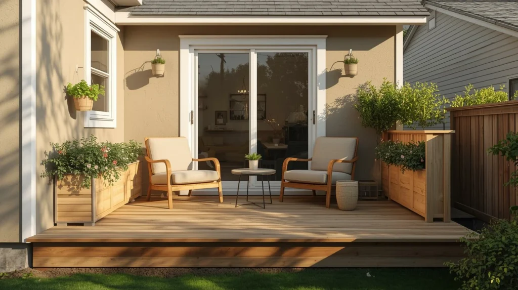 - Features: A compact platform with room for two chairs, a small table, and perhaps built-in planters.