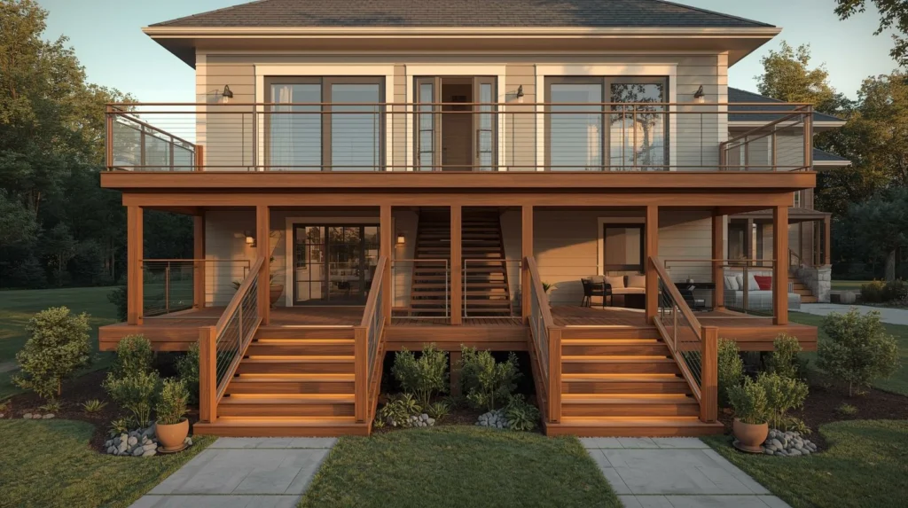 Homes built on slopes or raised foundations benefit from multi-level front decks. These designs combine visual depth with practical function.