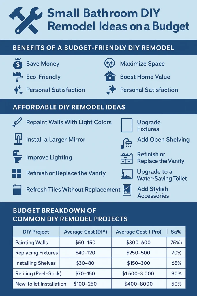 Small bathroom DIY remodel ideas on a budget include painting with light colors, upgrading fixtures, installing shelves, improving lighting, and refinishing vanities. Affordable upgrades such as peel-and-stick tiles, large mirrors, and water-saving toilets maximize efficiency and style. With careful planning, these cost-effective projects create a modern bathroom that improves comfort and increases home value.