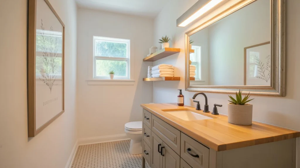 Mirrors expand space visually by reflecting light. Swap a small, outdated mirror for a wide or wall-mounted option. This upgrade costs little but makes a dramatic difference in both brightness and size perception.