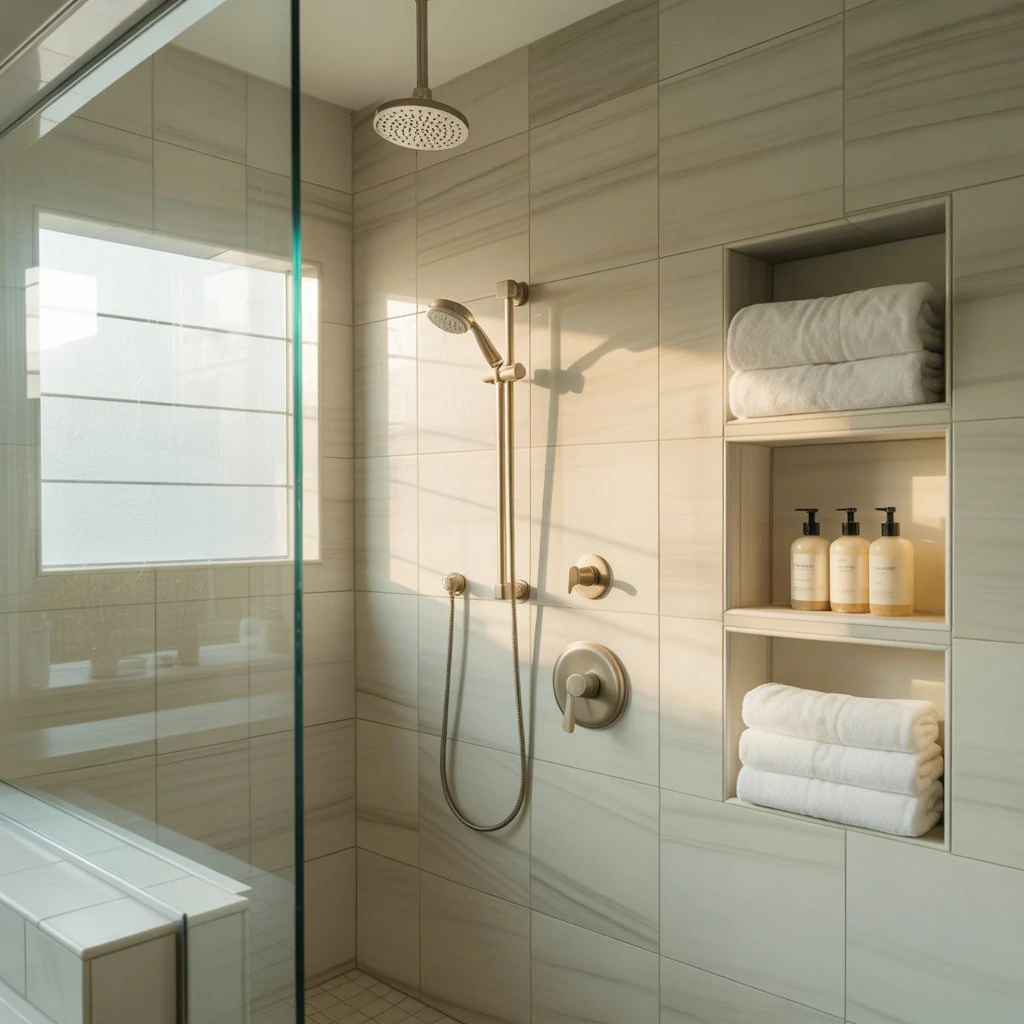 Lighting changes the mood and function of your shower. Use recessed ceiling lights, LED accents, or sconces for layered illumination.