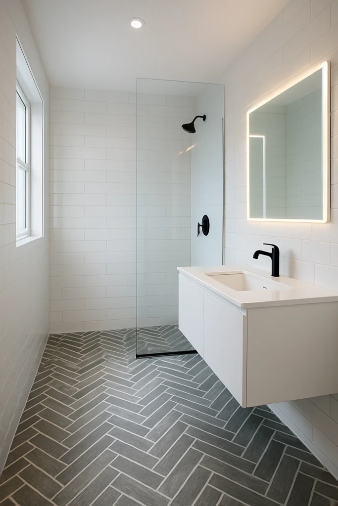 • Bold patterns: Hexagonal, herringbone, or mosaic tiles give personality without overpowering.